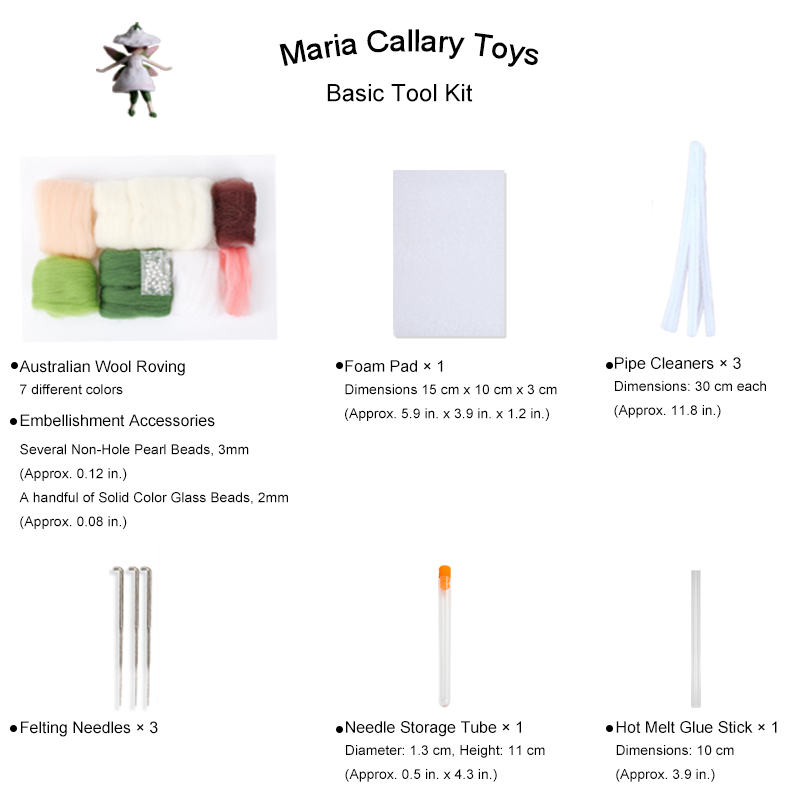Fairy Basic Kit (Body Not Pre-Felted): Includes Australian wool, embellishment accessories, foam pad, needle storage tubes, felting needles, pipe cleaners, and a hot melt glue stick.