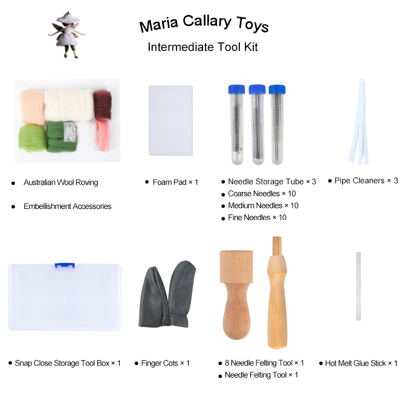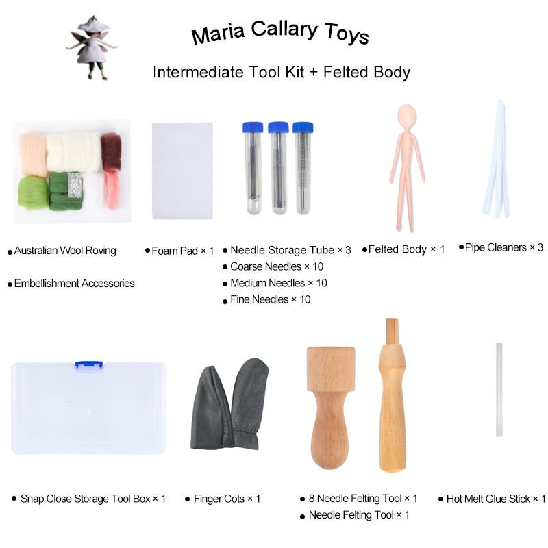 Fairy Intermediate Kit (Body Not Pre-Felted): Includes the Basic Kit along with an expanded toolset (30 felting needles, tool box, and more).